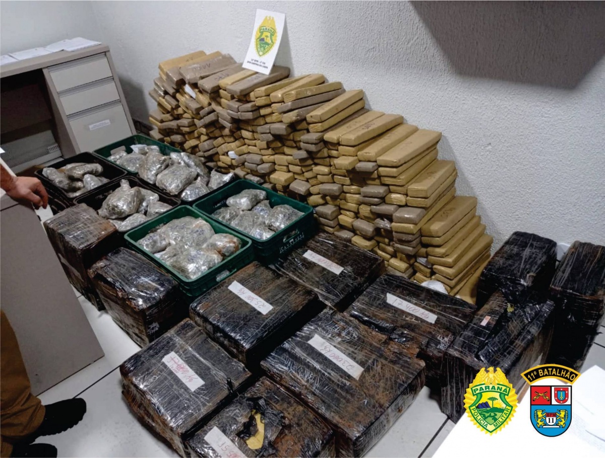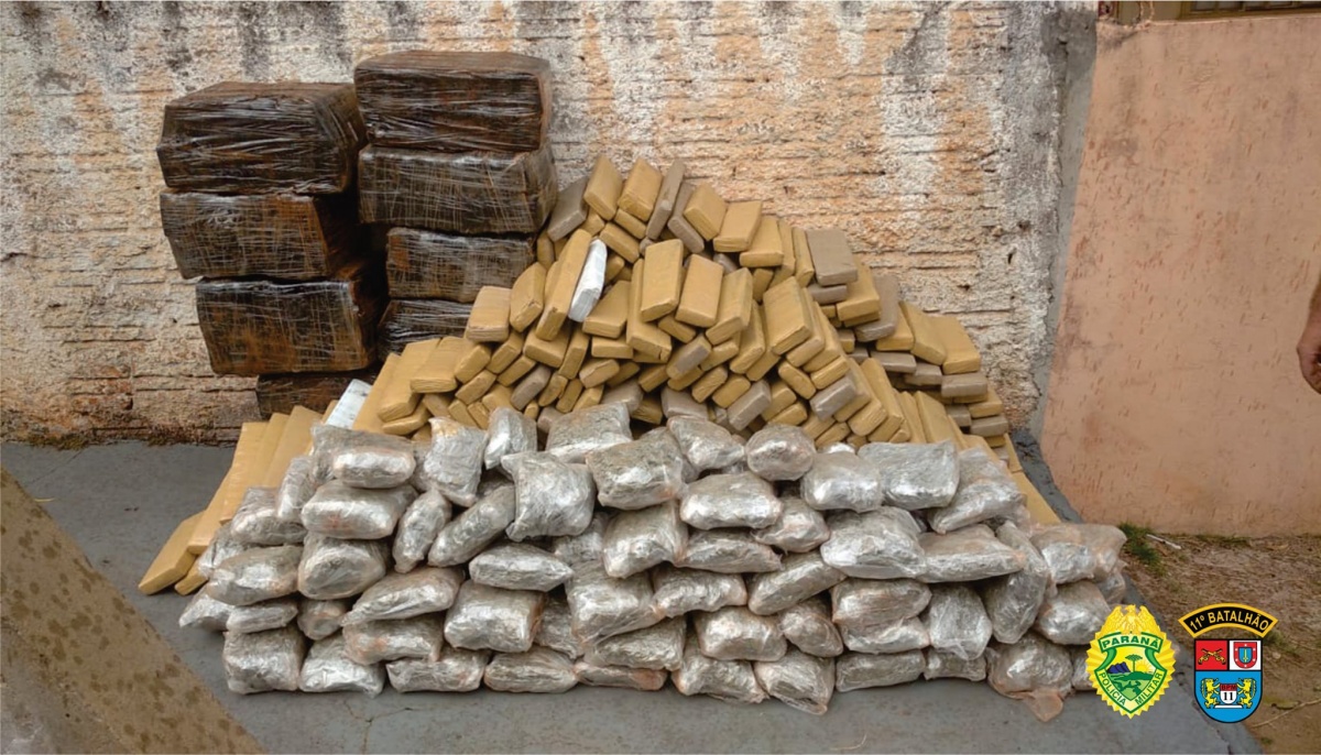 Policiais militares do 11º Batalhão de Polícia Militar apreenderam na tarde deste domingo (27), na cidade de Nova Cantu, 623 quilos de maconha e skunk (variedade mais potente da maconha). A ação teve início por volta das 12h30, quando uma equipe da PM realizava patrulhamento em Campina da Lagoa e suspeitou do veículo, que passou pela viatura em sentido contrário.